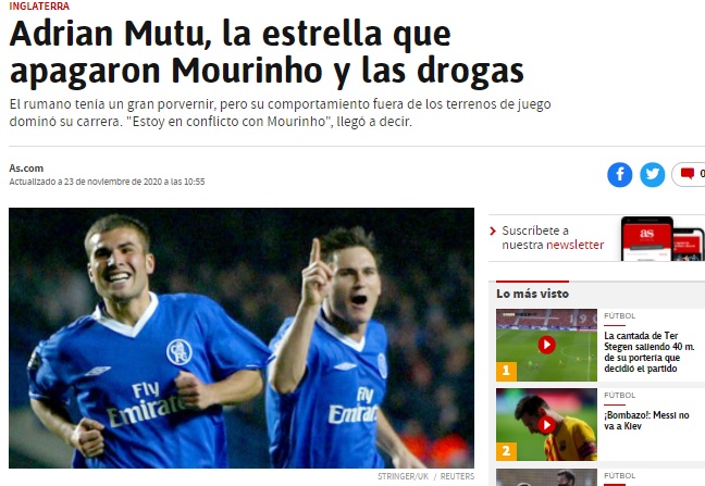 „Mourinho l-a întrebat ironic pe Mutu dacă s-a accidentat pe banca de rezerve sau acasă, apoi a izbucnit scandalul. Chelsea a comandat un test antidoping, la solicitarea portughezului, iar Mutu a fost suspendat pentru consum de cocaină. Viața lui dezordonată a pus capăt aventurii lui Mutu pe Stamford Bridge,” scriu cei de la AS.