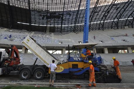 echipă de lucrători amenajează pista de atletism. Spre deosebire de