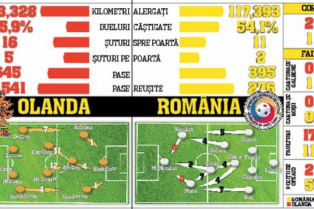 Conform statisticilor, jucătorii trimiși în teren de Victor Pițurcă au cumulat puțin peste 117 kilometri de alergare, cea mai bună performanță a unei echipe la acest turneu. De asemenea, tricolorii au bătut și recordul individual de kilometri alergați, Cociș trecându-și în cont 12,74 kilometri. Din păcate, românii au alergat mai mult pe lângă minge, raportul posesiei fiind zdrobitor în favoarea olandezilor, cu peste 61 la sută.