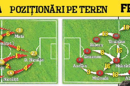 Dovada: a trimis doar 7 pase spre atacanți, dar niciuna filtrantă, ci numai când cele două vârfuri au coborât la primire, iar cele mai multe baloane le-a trimis spre fundașii laterali, Contra (7) și Raț (5). Spre deosebire, Makelele i-a servit cu 11 pase pe Benzema și Anelka, care nu au venit așa în spate ca atacanții noștri, iar cele mai multe mingi jucate de mijlocașul lui Chelsea au fost cu colegii săi din linia mediană,