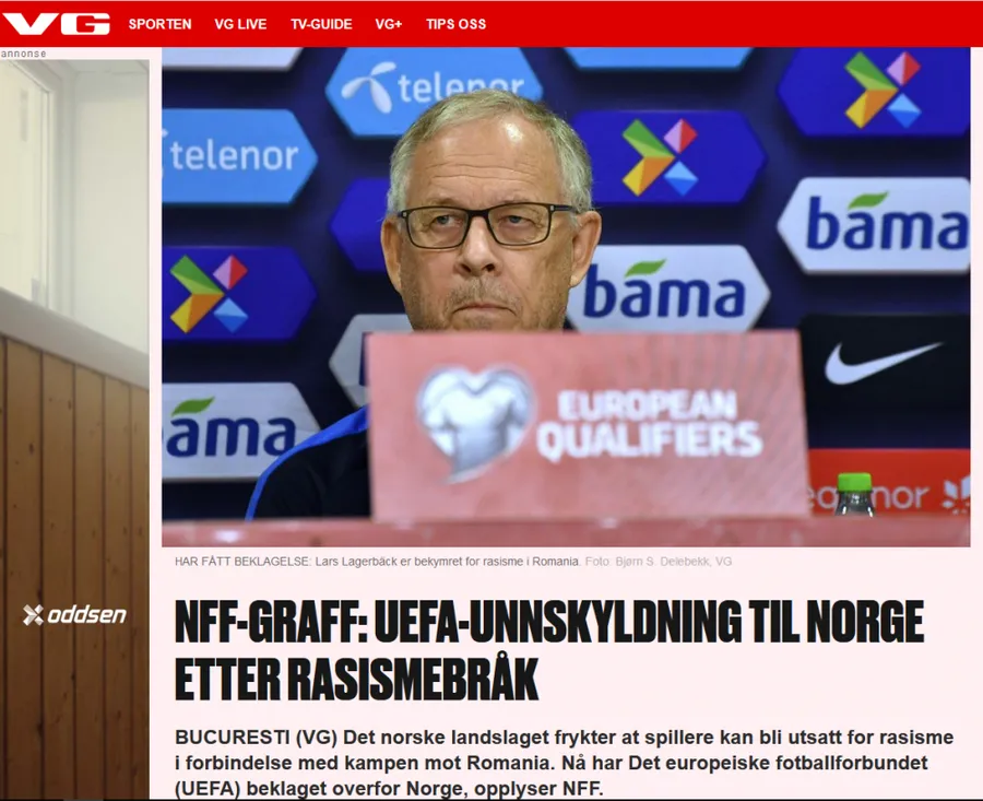 Norvegienii de la VG merg pe ideea că fotbaliștii selecționerului Lars Lagerback ar putea fi abuzați rasial de copiii care vor veni la meci, pe Arena Națională, după ce UEFA a închis porțile pentru oamenii cu vârsta de peste 14 ani. Mai mult, jurnaliștii nordici susțin că norvegienii vor să iasă de pe teren dacă vor avea loc astfel de episoade.