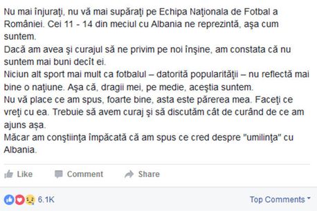 „Nu mai înjurați, nu vă mai supărați pe Echipa Naționala de Fotbal a României. Cei 11 – 14 din meciul cu Albania ne reprezintă, așa cum suntem.