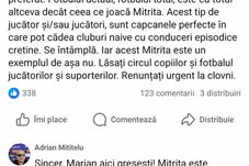 În secțiunea de comentarii a postării care a strâns câteva sute de aprecieri și-a făcut apariția și Adrian Mititelu. Patronul FC U Craiova a postat un amplu mesaj care la rândul lui a primit mai multe „like-uri”: