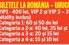 Dacă nu va reuși să dea toate bilete până pe 24 februarie, lucru greu de imaginat, FRF va scoate spre vânzare, la casele de bilete de la Național Arena, tichete cu doar 5 lei pentru pensionari și copii. Până atunci, cei interesați să îi vadă pe Suarez sau Forlan la București vor trebui să plătească între 400 și 10 lei. Vânzarea se va face, ca și până acum, exclusiv online și până pe 23 februarie pe cele patru site-uri care colaborează cu FRF: www.biletefotbalonline.ro, www.bilete.ro, www.eventim.ro și www.myticket.ro.
