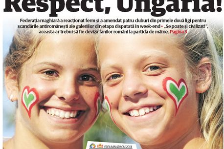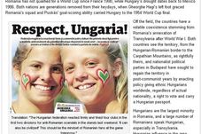 „În afara terenului, există o stare de tensiune generată de situația Transilvaniei de după Primul Război Mondial. Ambele țări au revendicat, de-a lungul istoriei, teritoriul aflat acum în posesia României. Aceste dispute au constituit permanent motive de dispute politice, maghiarii fiind cea mai numeroasă minoritate din România (cei mai mulți trăind în Transilvania). În weekend-ul care a precedat partida, Federația de la Budapesta a dat un semnal de normalitate, după ce a amendat patru cluburi din primele două divizii pentru scandări iresponsabile la adresa țării vecine. Aceleași semnale au venit și dinspre București, românii exprimându-și speranța că meciul nu va fi umbrit de conflicte inter-etnice, însă suporterii maghiari au arătat încă de aseară, de la plecarea de la Budapesta, că nu vor avea un comportament ireproșabil.„