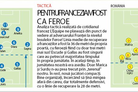 Foarte important mi se pare faptul că Răzvan Lucescu a știut să se facă ascultat și înțeles. România chiar a crezut. Cei unsprezece, mă rog paisprezece, care au fost pe teren au depășit tracul și nu au arătat nicidecum respectul acela umil față de un adversar incomparabil mai puternic. Apostol s-a comportat ca în interviul pe care îl dăduse ProSportului sâmbătă: „Băi, Toulalan, tu dacă te nășteai la Târgu Jiu și jucai la Pandurii erai un oarecare”… Maftei s-a bătut cu Henry, Raț l-a anihilat pe Ribery, și Ghioane pe Gourcuff. Chivu a respins tot în jocul aerian, iar cele câteva ezitări „terestre” au fost rezolvate de un Coman impecabil. Sunt plusuri certe într-un joc în care dintr-o preluare și două atingeri de balon îți dădeai seama că albaștrii sunt din alt aluat de fotbaliști.