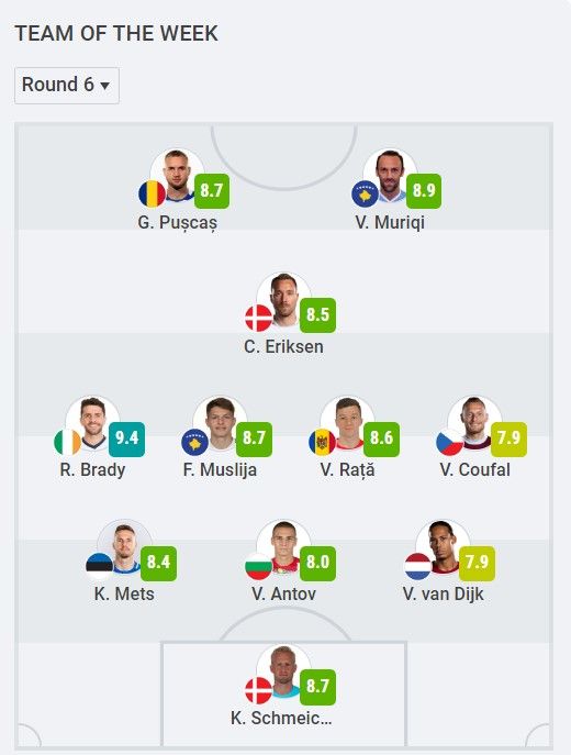 George Pușcaș, marcatorul a două goluri în partida câștigată de România, scor 4-1, cu Bosnia și Herțegovina, a fost notat cu 8,7, sub Vedat Muriqui (8,9), dar peste Christian Eriksen (Danemarca/ 8.5).