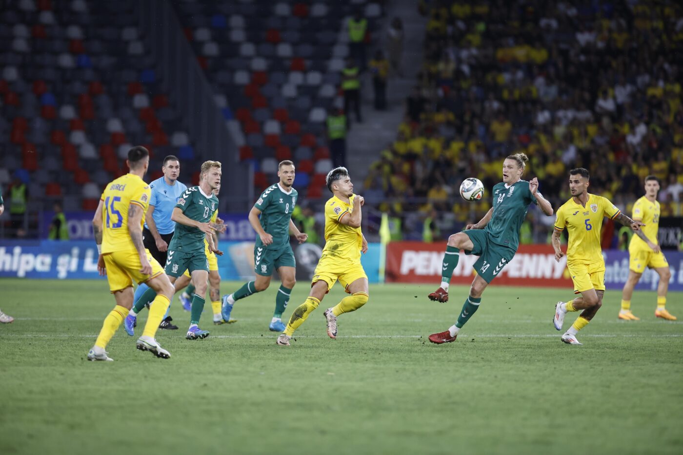 Deschidem scorul în minutul 4 și continuăm să hăituim, din benzi, jumătatea balticilor. Ne-a rămas, în pulpă, avântul din Kosovo și am înghețat amintirile cu… „echipele mici”. Avem aplomb și dăm senzația, în startul jocului, că plutim peste adversar. Ghencea e inundată de ecoul care ne-a umplut, multora, copilăria: „Rooomânia, Rooomânia!”.