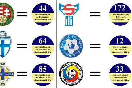 Cea mai slab cotata adversară din grupa F, Feroe, a surprins ieri după ce și-a anunțat obiectivul: „O să încercăm să atacăm locul doi. Dar suntem conștienți că nu avem forța celorlalte echipe, motiv pentru care nu vom fi supărați dacă vom ocupa doar locul trei. Se pot califica mai multe echipe acum și sperăm să ne numărăm printre surprizele acestei grupe. Toți ochii sunt pe Grecia, pe Ungaria, pe România. Nu își dau seama că putem să îi incurcăm”, a declarat pentru ProSport Kari Mikkelsen, un jurnalist sportiv din Feroe. România a întâlnit Insulele Feroe de patru ori. Tricolorii au câștigat de fiecare dată, golaverajul general fiind de 15-1 în favoarea naționalei lui Victor Pițurcă.