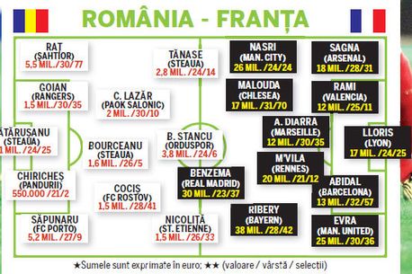 Chiar dacă oamenii din anturajul lui Pițurcă susțin că Franța e slabă la nivelul fundașilor centrali, sunt șanse puține ca tricolorii să pună pericol în acea zonă. Forța ofensivă a României e aproape inexistentă și, mai mult, în acest meci vor lipsi oamenii care să-l aprovizioneze cu pase pe Bogdan Stancu. Lazăr ar fi fost o variantă, dar selecționerul intenționează să-l titularizeze pe Bourceanu.