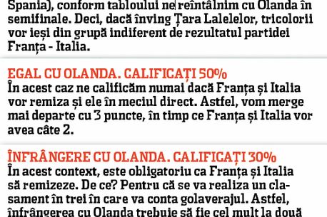 România poate merge mai departe și dacă pierde cu Olanda, dar la fel de bine poate să se întoarcă acasă neînvinsă în cazul unui egal, dacă Italia și Franța nu termină la egalitate între ele.