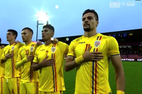 Minutul 1: A început meciul de la Aalborg, a început o nouă campanie de calificare pentru Campionatul European. Tudor Băluță este căpitanul tricolorilor în partida contra Danemarcei.
