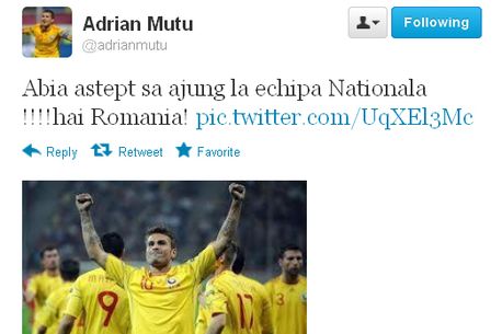 „Abia aștept să ajung la echipa națională!!!!! Hai România!”, a scris Mutu pe contul său de Twitter și a atașat o imagine ce îl înfățișează celebrând golul înscris la ultima apariție în tricoul naționalei