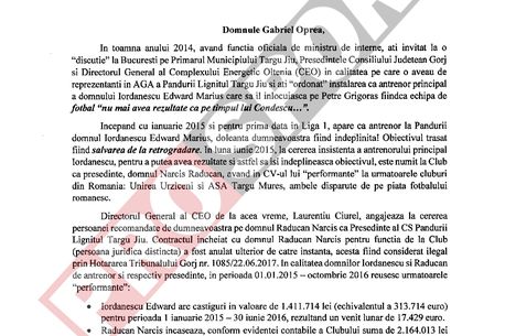 „În toamna anului 2014, având funcția oficială de ministru de interne, ați invitat la o discuție la București pe Primarul Municipiului Târgu Jiu, Președintele Consiliului Județean Gorj și directorul General al Complexului Energetic Oltenia, în calitatea pe care o aveau de reprezentanți în AGA a Pandurii Lignitul Târgu Jiu și ați «ordonat» instalarea ca antrenor principal a domnului Iordănescu Edward Marius care să îl înlocuiască pe Petre Grigoraș, fiindcă echipa de fotbal nu mai avea rezultate ca pe timpul lui Condescu.