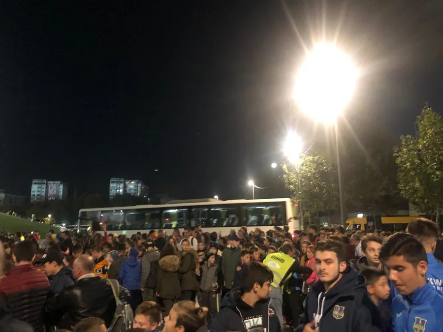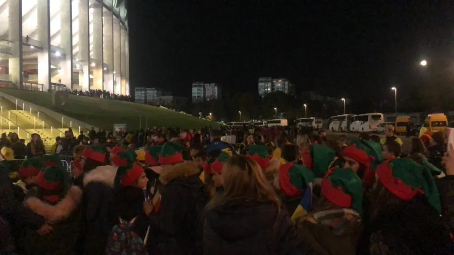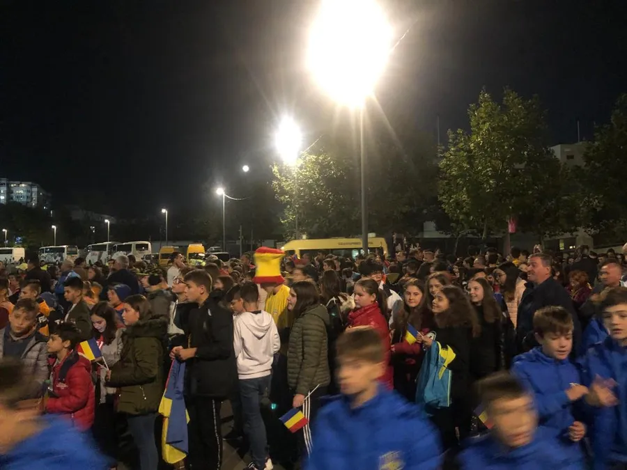 20:52 Reporterul ProSport, Octavian Vasilescu, a stat de vorbă cu însoțitorul copiilor din Cajvana, Suceava. Mai bine de opt ore au petrecut micuții pe drum ca să-i vadă ”pe viu” pe elevii lui Contra: “Am plecat la 12 spre București, am venit bine. Suntem dintr-o localitate de lângă Suceava. Cajvana se cheamă. Nu o sa țineți minte! Doar dacă va gândiți unde s-a luptat Ștefan cel Mare și că a mâncat caș. Diseară plecăm înapoi după meci, nu rămânem în București. Am văzut mii de autocare. Cei mici sunt foarte bucuroși că am reușit să venim la meci. Hai, România!”
