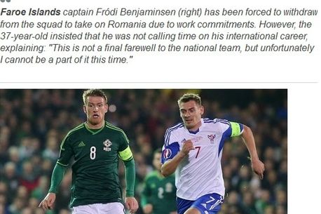 Frodi Benjaminsen, căpitanul naționalei de fotbal a Insulelor Feroe, nu va face deplasarea pentru meciul programat pe „Ilie Oană” din Ploiești, pe 29 martie, de la ora 19:00. UEFA a anunțat faptul că fotbalistul în vârstă de 37 de ani, care lucrează pe un șantier, este obligat de angajatorii săi să ajute în următoarea perioadă la construirea unui mall, astfel că nu poate participa la meciul din preliminariile Campionatului European din 2016.