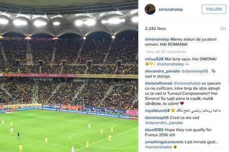 Halep i-a încurajat însă pe fotbaliștii naționalei timp de 90 de minute, postând și o fotografie de la fața locului pe contul personal de Instagram. În descriera fotografiei, constănțeanca a scris un mesaj de încurajare pentru jucătorii naționalei