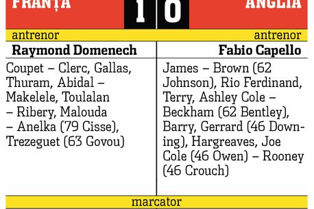 În lipsa unor jucători ca Henry, Vieira sau Benzema, echipa lui Domenech și-a arătat limitele în întâlnirea cu Anglia. Am văzut o echipă tristă, fără idei, dominată la toate capitolele de o formație care va vedea la televizor Campionatul European. Victoria „cocoșilor” a venit dintr-un penalty obținut de Anelka în urma singurei faze demne de o vicecampioană mondială. Poate mai trist decât jocul în sine a fost faptul că încă de la sfârșitul reprizei secunde în tribune se instalase o stare de somnolență, unii dintre spectatori căscând la propriu, ca răspuns la „spectacolul” de pe teren.