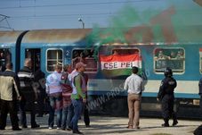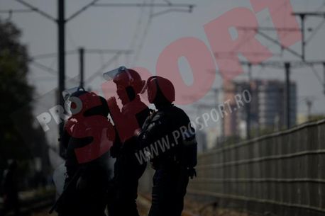 Fanii au aruncat fumigene și petarde la intrarea în gara Băneasa, iar pe tren erau arborate steaguri ale Ungariei.