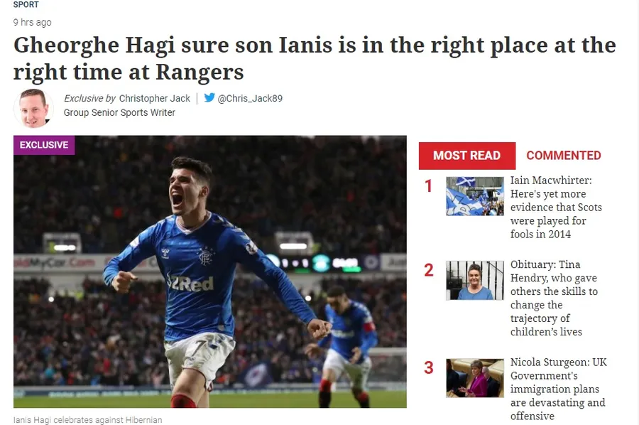 Ianis Hagi este unul dintre jucătorii surpriză din campionatul scoțian. S-a impus rapid în prima echipă a lui Glasgow Rangers, iar fanii și jurnaliștii sunt încântați de internaționalul român. Gheorghe Hagi a acordat un interviu în presa scoțiană. Și-a lăudat băiatul și a spus că este convins că Ianis are o șansă să fie cumpărat de Glasgow Rangers.