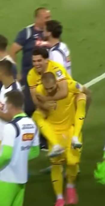 Bucuria de pe banca noastră a fost una mare, inclusiv din partea lui Edi Iordănescu, însă Ianis Hagi a părut cel mai exuberant: internaționalul român l-a luat prin surprindere pe Denis Alibec și i-a sărit în spate acestuia.
