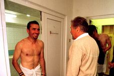 Emil Constantinescu și Gică Hagi, într-un moment de apreciere reciprocă, imediat după un meci al naționalei