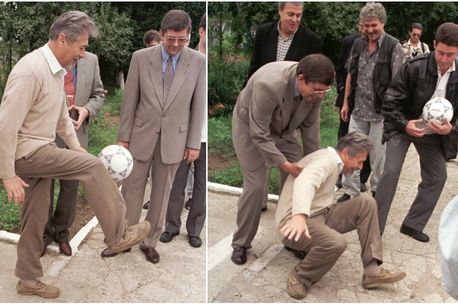 Dacă o vor face, prezidențiabilii trebuie să fie atenți să nu repete pățania fostului șef al statului, Emil Constantinescu. În primăvara lui 1998, echipa antrenată de același Anghel Iordănescu se pregătea pentru Campionatul Mondial din Franța în cantonamentul de la Săftica. Cu puțin timp înainte de plecarea spre Albi, Franța, jucătorii au fost vizitați de președintele Emil Constantinescu. Bine dispus, șeful statului a vrut să arate că se pricepe să jongleze cu mingea primită cadou de la oficialii FRF și a încercat să o țină pe picior. Din nefericire, Constantinescu a fost copleșit de ocazie și a căzut în fund, spre amuzamentul selecționerului Iordănescu. În spatele său, oficialul FRF, Ioan Piscanu, a încercat să salveze aparențele, ridicându-l pe președintele României de subțiori.