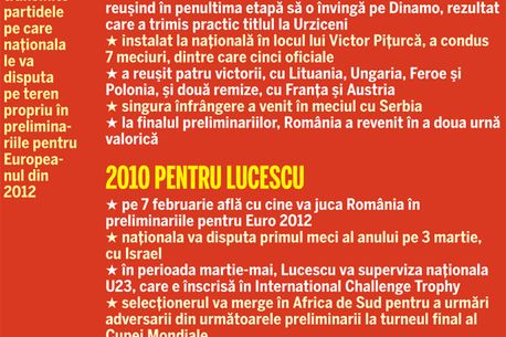 La capătul unui an în care a trecut de la FC Brașov la echipa națională, Lucescu junior spune că e mulțumit de primele rezultate pe banca naționalei. Partida cu Serbia și escapadele lui Mutu și Cristea de dinaintea aceluiași meci sunt, în schimb, dezamăgirile. Domnule Lucescu, cum se văd acum experiențele prin care ați trecut în 2009? Pentru mine a fost un an excelent, dar dificil. Am avut returul cu Brașov, cu puncte câștigate în fața echipelor mari, apoi numirea la națională, unde am luat-o de la zero, iar echipa a reușit patru victorii și două remize în șapte meciuri, în condițiile în care cinci partide au fost jucate în deplasare. Care ar fi în schimb dezamăgirile de la instalarea la națională? În primul rând, săptămâna de dinaintea meciului de la Belgrad și rezultatul de acolo. A fost și vina mea că nu am putut să-i conectez la joc pe cei din lot. S-a văzut o altă atitudine, altă dispoziție, nu mai era ca la celelalte acțiuni, când toată lumea era concentrată. O altă dezamăgire a fost faptul că am avut meciuri cu multe ocazii și am marcat puțin. Am avut probleme și la fazele fixe, și cu accidentările. Nu zic că ar fi cineva vinovat, dar la fiecare acțiune au fost jucători indisponibili, problemă cu care adversarii noștri nu se confruntau. Au existat voci care v-au reproșat stilul în care a jucat echipa națională și victoriile scurte, cu 1-0, din meciurile cu Lituania, Ungaria și Polonia. Aici vorbim în mod special de conducătorii de club.