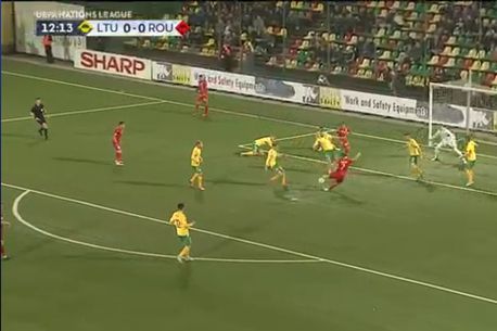 Minutul 10: Ce șansă ratează Lituania! Cernych pune bine piciorul la o centrare venită din dreapta, a lui Slavickas, dar balonul se oprește în bară. Tătărușanu era bătut.