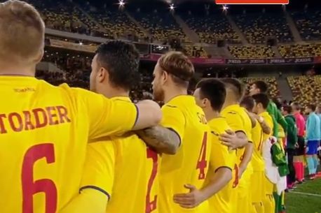 21:00 START în partida de pe Arena Națională. Suporterii naționalei României au avut parte de o surpriză din partea tricolorilor care au purtat tricouri inscripționate cu numele a 11 fani. Din păcate, Mihai Bălașa a acuzat o accidentare la încălzire și a fost schimbat cu Sergiu Hanca în flancul drept al apărării.