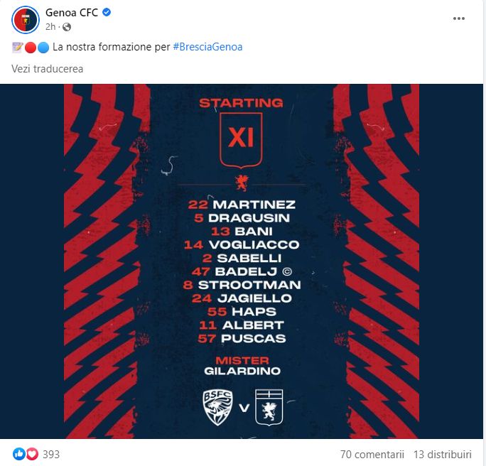Înaintea acestei partide, Genoa a anunțat primul 11, iar George Pușcaș era printre titulari.