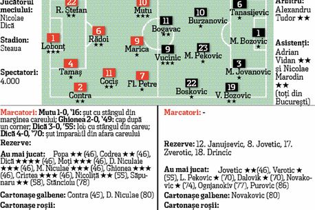Între două pase din prima și o deviere subtilă, Dică a punctat din nou din afara careului, închizând tabela. Ocazii au mai fost, dar tricolorii le-au irosit cu nonșalanță, lăsându-ne să ne întrebăm: cu cine jucăm la Euro? Cu titularii care au cam „sărit coarda“ sau cu rezervele care „au mâncat gazonul“.