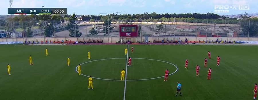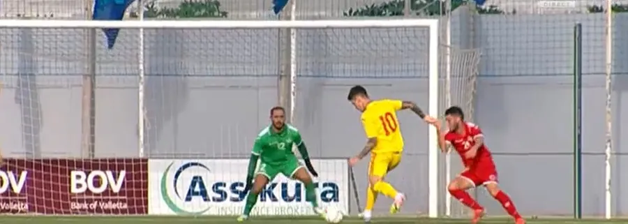 MIN 32. Faza superbă a naționalei lui Adi Mutu. Olaru trece mingea peste un adversar și îi pasează superb lui Mihăilă, dar șutul atacantului Craiovei a fost blocat de portarul Aquilina.