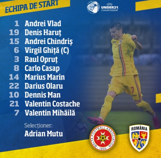 ROMÂNIA U21: 1. A. Vlad – 19. Haruț, 15. Chindriș, 6. Ghiță (cpt), 3. Opruț – 8. Casap, 14. M. Marin, 22. Olaru – 10. Man, 21. Costache, 7. Mihăilă. Selecționer: Adrian Mutu.
