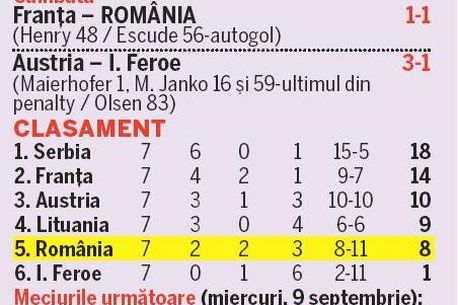 Miercuri, la București, împotriva Austriei (stadionul Steaua, ora 20:45), tricolorii dispută meciul cu numărul 8 din preliminarii. Partida ne poate dezlipi, dacă învingem, de rușinosul loc 5.