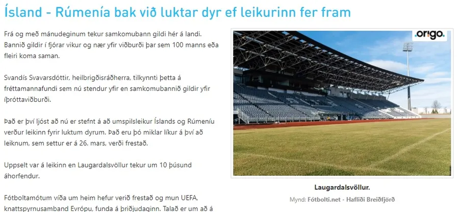 Mai sunt 13 zile până la partida Islanda-România, dar meciul este sub semnul întrebării. Deocamdată se știe sigur că se va juca fără spectatori. Ministerul Sănătății din Islanda a anunțat că au fost interzise toate evenimentele la care participă mai mult de 100 de persoane, în condițiile pandemiei de coronavirus. Interdicția este valabilă patru săptămâni.