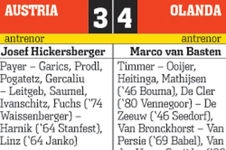 Ce am văzut după pauză a fost dintr-o altă realitate. A intrat Bouma în locul gafeurului Mathijsen, Seedorf i-a luat locul absentului De Zeeuw, a fost folosit pe final și Vennegoor of Hesselink. Am simțit cumplita presiune olandeză asupra adversarilor și am asistat la „execuția“ neexperimentatei defensive a Austriei, deloc cruțată de elevii parcă turbați ai lui Van Basten. Fundașul – golgheter Heitinga (‘67), Vennegoor of Hesselink (‘83) și același Huntelaar (‘86) au readus lucrurile la normalitate, tradusă într-un 4-3 pentru Olanda. Morala? Ce începe foarte prost se poate termina minunat de bine… Bine pentru ei, îngrijorător pentru noi, pentru că furtuna ofensivă din partea secundă ne pune pe gânduri.