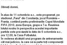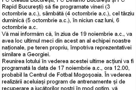 Într-un comunicat semnat de Mircea Sandu și Ionuț Lupescu și adresat lui Dumitru Dragomir, FRF "roagă" oficial Liga Profesionistă de Fotbal să nu mai programeze meciurile echipelor românești care participă în cupele europene în ziua în care va fi reunirea echipei naționale, așa cum s-a întâmplat ultima oară, când Steaua a jucat luni, spre mânia antrenorului Victor Pițurcă. Motivația oficială a acestei cereri este aceea că există un "program de antrenamente judicios".