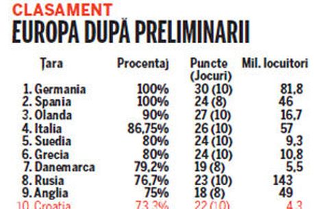 „Alții au o arie de selecție mult mai mare”. România a terminat Grupa D după Bosnia, țară cu o populație de aproape șase ori mai mică. La nivelul preliminariilor, în ansamblu, ne-am clasat după țări precum Muntenegru (0,6 milioane de locuitori), care are o populație de peste 35 de ori mai mică decât a României (22 de milioane de locuitori). Suntem pe locul 26 în clasamentul sportiv, deși țara noastră e pe locul 10 în Europa ca număr de locuitori, iar două dintre națiunile situate înaintea noastră (Polonia și Ucraina) n-au participat la preliminarii.