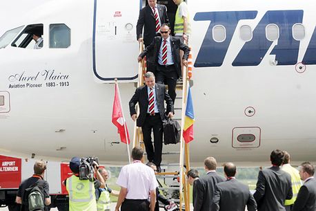 Eveniment important, ieri, pentru micuțul aeroport de lângă St. Gallen (aflat la 20 de kilometri de oraș). În jurul orei 13:00 (ora 14:00 în România) aeronava Aurel Vlaicu care a transportat delegația României a aterizat în aplauzele celor câteva zeci de susținători (foto jos), majoritatea români, restul localnici, prezenți la aeroport.