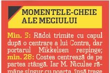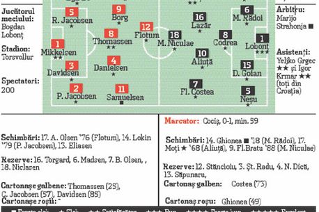 Tricolorii au terminat apărându-se. Frig, ploaie măruntă și semiîntuneric. Un teren îmbibat cu apă și 11 adversari dispuși pe trei rânduri, cel mai avansat dintre ele situat la marginea careului mare. Acestea au fost condițiile în care naționala României a încercat reabilitarea după înfrângerea rușinoasă de acasă, cu Lituania. Tricolorii au început partida la fel de umezi ca vremea de afară. Slabi și în lipsă de inspirație, jucătorii s-au complăcut în acțiuni fără șanse de izbândă în fața unei apărări mai mult decât supraaglomerate. Nici Aliuță, nici Costea, fotbaliști tehnici, propuși de Pițurcă pentru a pătrunde prin pădurea feroeză, nu au luminat jocul echipei. Apoi, ghinion, Rădoi s-a rupt. Nu ne așteptam de la el să câștige meciul, dar era un jucător important măcar pentru că are personalitate și putea transmite echipei forța și ambiția lui. Sistemul defensiv nu se clatină, pentru că gazdele calcă în careul nostru abia prin minutul 45, la un aut obținut eroic.
