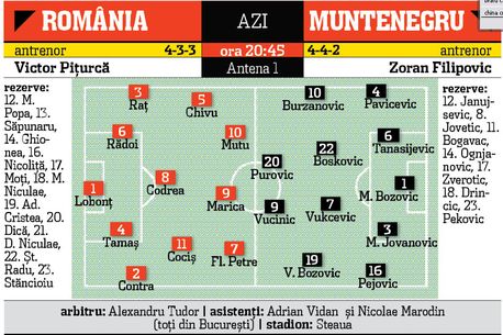 „În mare, echipa care va juca în meciul cu Muntenegru va fi aceeași cu care voi aborda meciul cu Franța”, a declarat ieri Pițurcă. Pe de altă parte însă, surse autorizate susțin că amicalul cu trupa lui Vucinic ar putea însemna și elucidarea anumitor semne de întrebare pentru Piți. Selecționerul s-ar putea edifica asupra randamentului cuplului Tamaș–Rădoi, dar și asupra lui Marica, jucătorul care pare să nu fi ieșit încă din pasa proastă din Bundesliga.