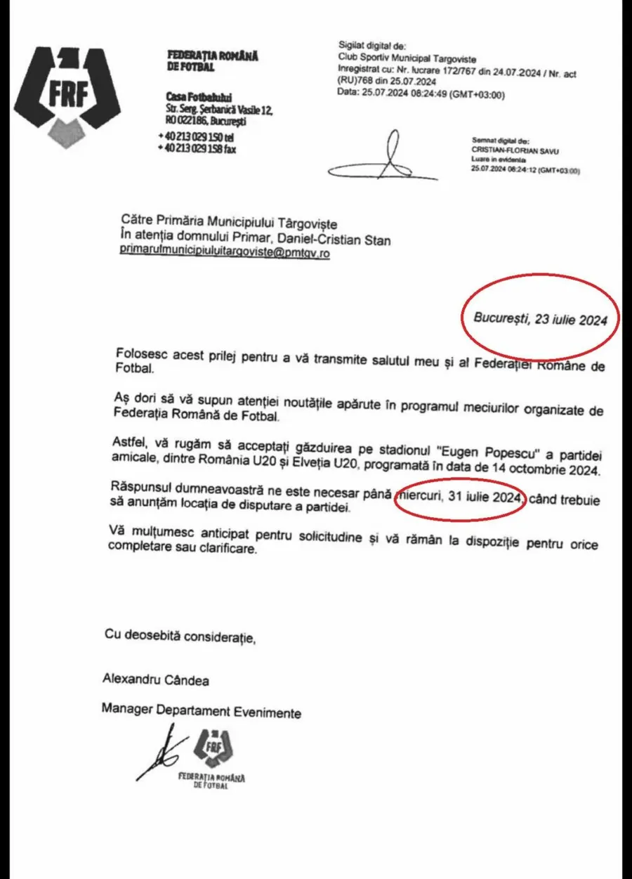 ProSport a intrat în posesia unor documente care nu denotă altceva decât amatorismul autorităților locale, cele care se laudă că promovează sportul și imaginea municipiului Târgoviște, un oraș depopulat masiv în ultimii ani, din cauza nivelului tot mai scăzut de trai. Concret, organizarea meciului a fost parafată abia la sfârșitul lunii septembrie, deși FRF transmisese printr-o adresă oficială, acum trei luni, că locul disputării meciului trebuie confirmat până pe 31 iulie, ca apoi să fie înștiințată UEFA.