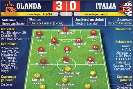 În partea a doua, Donadoni aruncă în teren și ultimele speranțe, Del Piero și Cassano, dar squadra azzurra e crispată, iar Van der Sar oprește și puținele tentative serioase ale italienilor, prin Grosso și Pirlo. Iar Van Bronckhorst semnează sentința: 3-0, suficient ca bata lui Afellay să fie ignorată. Italia poate se trezește și se prezintă la următorul meci. Deși, mai bine nu. Că e cu România…