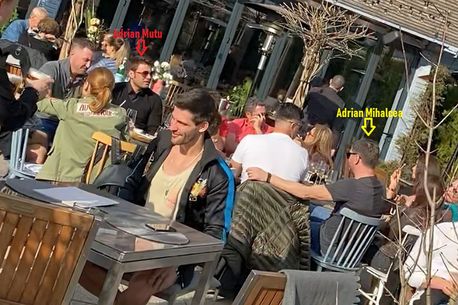 Adrian Mutu (41 de ani) și Adrian Mihalcea (43 de ani) au fost surprinși pe terasa unui local din București, la 48 de ore după ce presa a scris că „Briliantul” ar fi fost bătut crunt de un interlop!