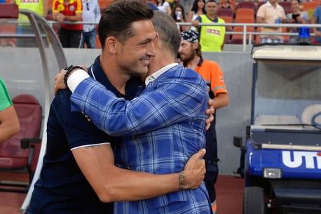 Finantatorul Steaua Bucuresti, Gigi Becali, se imbratiseaza cu antrenorul Mirel Radoi inaintea meciului Steaua Bucuresti cu FC CFR 1907 Cluj din etapa a 3-a a Ligii I, disputat in Bucuresti, sambata, 25 iulie 2015. DRAGOS SAVU / MEDIAFAX FOTO