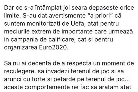 UEFA este cu ochii pe meciurile noastre după alte episoade care s-au petrecut în meciurile anterioare, atât de pe teren propriu cât și din deplasare. „Fotbalul fără spectatori nu are niciun farmec. Tot timpul am apreciat suporterii care își încurajează echipa favorită, mai ales când aceasta evoluează în deplasare. Dar ce s-a întâmplat joi seară depășește orice limite. S-au dat avertismente „a priori” că suntem monitorizați de Uefa, atât pentru meciurile extrem de importante care urmează în campania de calificare, cât și pentru organizarea Euro 2020.