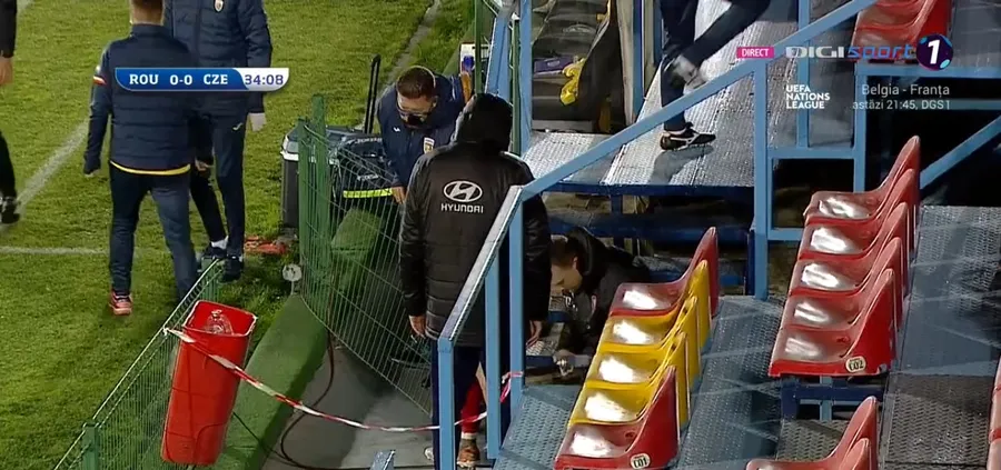 Min. 33: Krobot e faultat și își prinde piciorul în gardul împrejmuitor al terenului!
