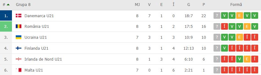 După eșecul din Ucraina, România rămâne pe locul 2 în Grupa 8, cu 16 puncte. Danemarca este lider, cu 22 de puncte. Pe locul 3 se află Ucraina, cu 10 puncte și un meci mai puțin, la egalitate de puncte cu Finlanda, echipa de pe locul 4.