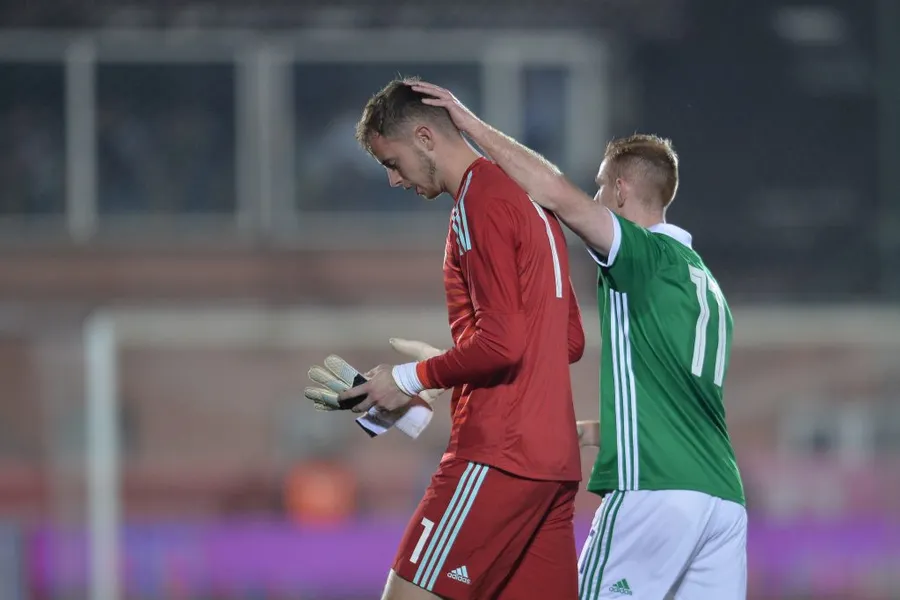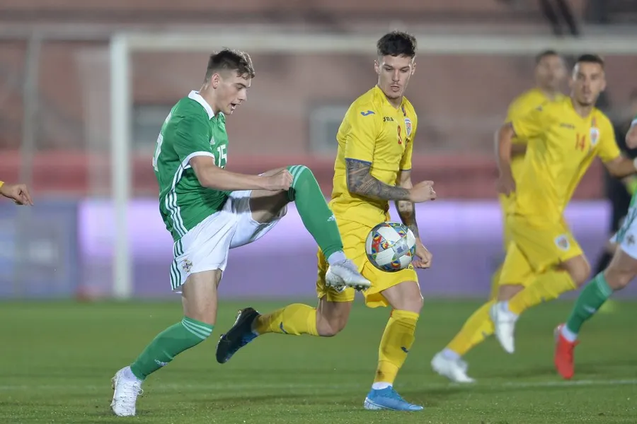 Liam Hughes (D), de la Irlanda de Nord U21, apara in meciul de fotbal contra selectionatei Romaniei U21, din preliminariile EURO 2021, disputat pe stadionul Anghel Iordanescu din Voluntari, luni, 14 octombrie 2019. ALEXANDRU DOBRE / MEDIAFAX FOTO